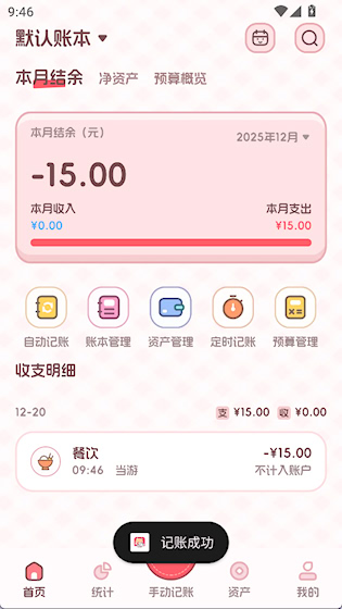 3、记账完成后会显示账单和统计在首页