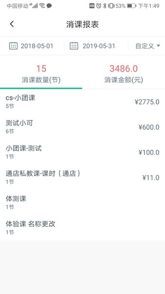 4、在消课报表中我们可以看到课程的价格,在中间可以选择时间;