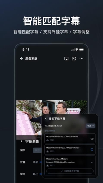 支持智能搜寻影片字幕并自动下载,支持切换多语言字幕,支持下载和添加外挂字幕、调整字幕的字号、位置和时间偏移。
