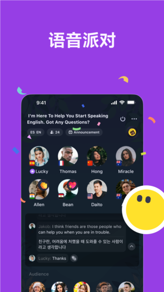 •语聊派对:随时加入语音房间,和母语者及其他学习者实时交流,轻松提升口语能力。无论是日常话题还是文化交流,提供自然的语言环境,特别适合不擅长面对面交流的用户。