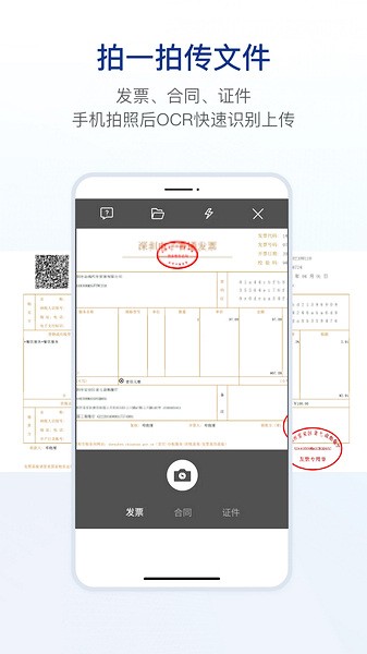 手机拍摄发票、合同、证件,OCR快捷识别上传至企业云文件。