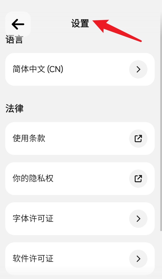 5、点击右上角齿轮按钮进入设置,可切换显示语言,查看使用条款与隐私权政策等法律相关信息。