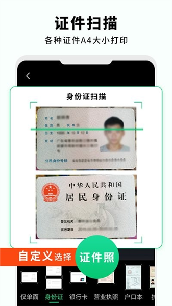4、证件扫描:支持多种证件类型,对应身份证,银行卡,驾驶证等证件进行扫描快速打印。
