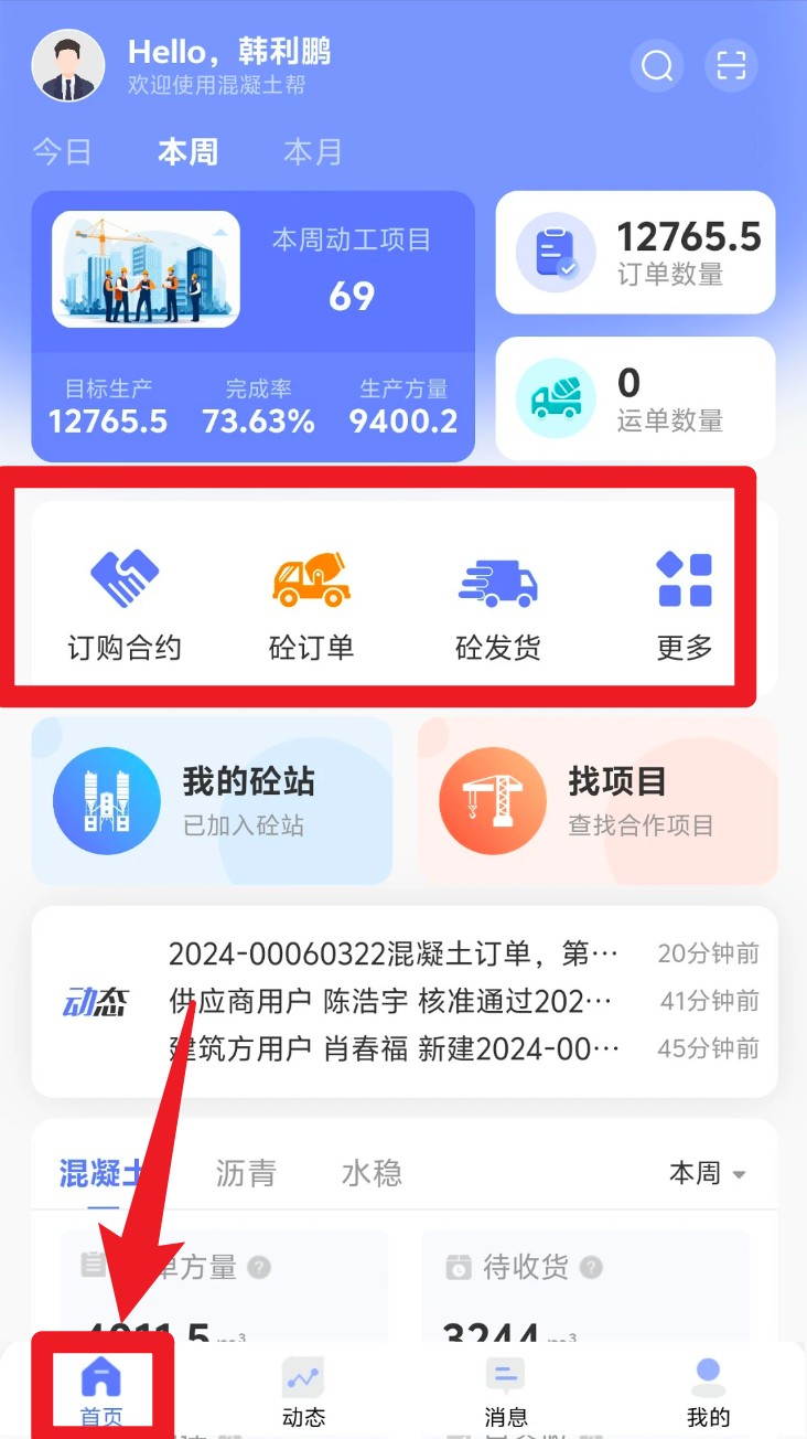 3. 登录成功后默认跳转首页,可查看当前订单量、发货量、动工项目数等数据,并快速进入合同等功能模块。