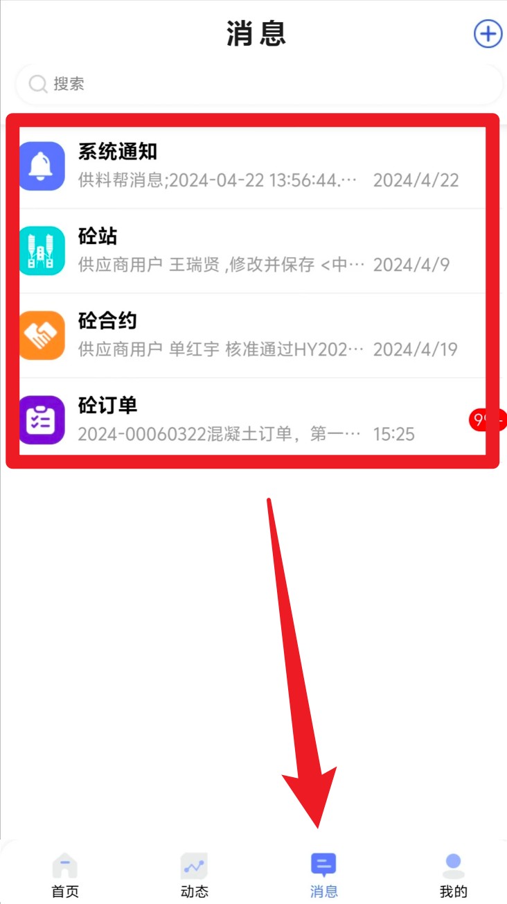4. 点击底部导航栏的消息,即可进入通知中心,查看系统通知、合同动态及订单提醒等内容。