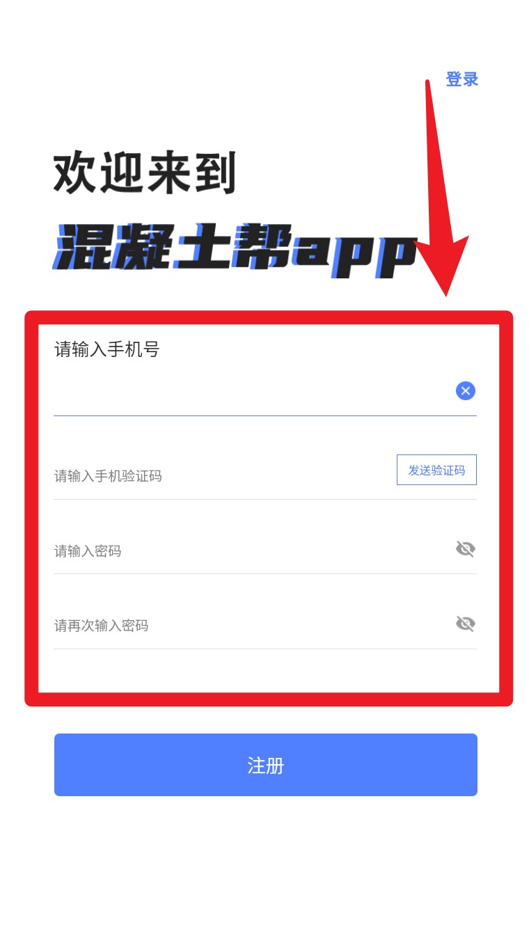 1. 打开App之后,进入注册页面,依序填写手机号、验证码及两次密码,点击底部的注册按钮完成注册。