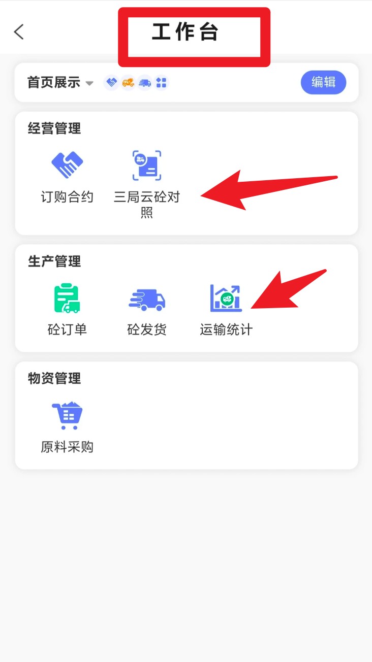 5. 在工作台页面中,可管理采购合同、查看运输统计及使用三局云砼对照等工具,支援日常经营操作。