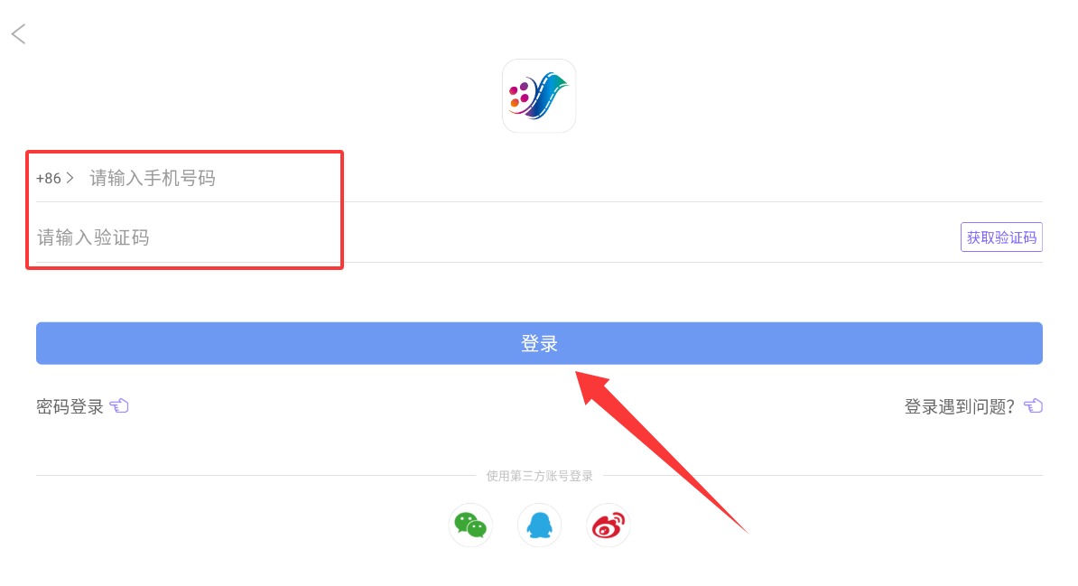 2、进入账号登录窗口,填写手机号获取动态密码登入,或直接选用第三方社交账号快速绑定。