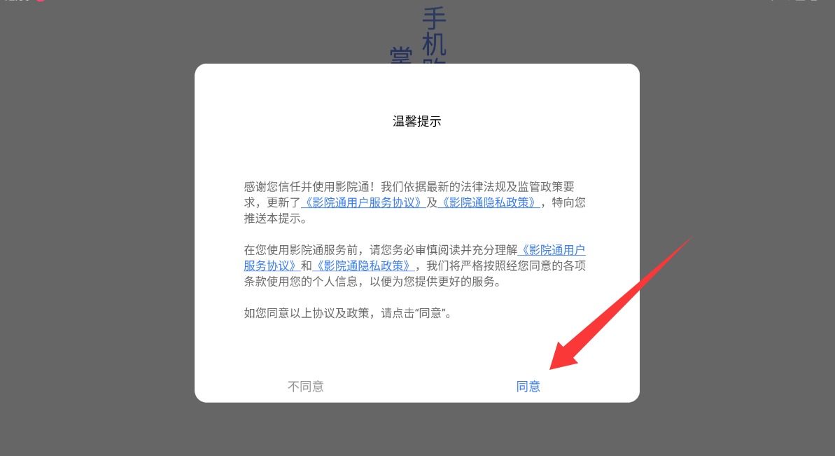1、启动影院通购票软件,初次运行需勾选服务条款与隐私声明,确认后跳转至首页界面。