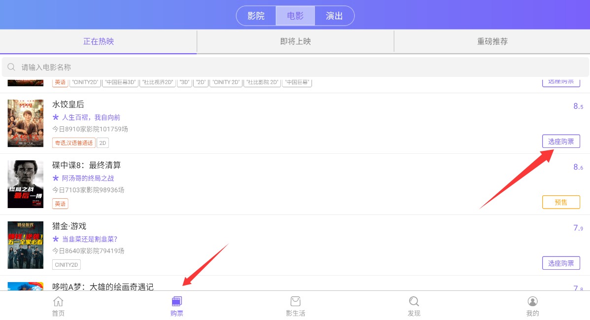 3、切换至购票界面,挑选心仪影片后轻触选座购票按钮,完成在线选座与支付操作。