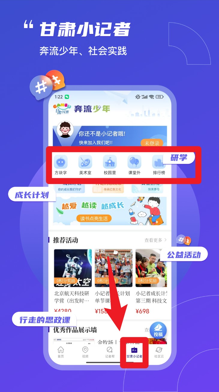 3. 进入甘肃小记者专区,可参与线上成长活动,浏览美术、校园、排行榜等内容。