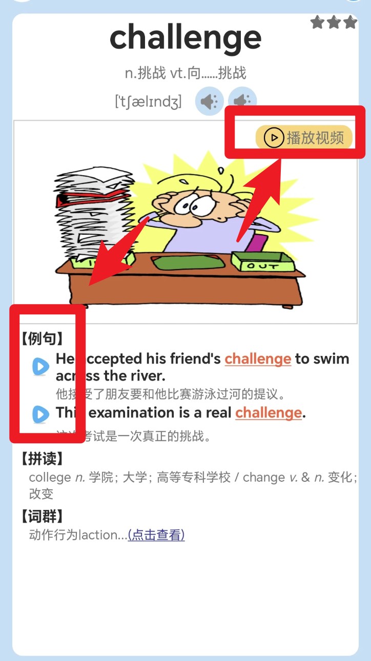3. 在单词学习页面,可查看词义、例句、插图并点击播放视频或例句朗读音频。