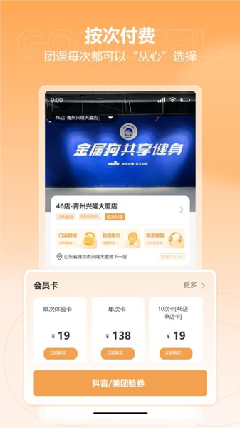 可以通过软件直接购买健身卡,这样就可以直接出示健身卡二维码轻松扫码进入健身场馆;