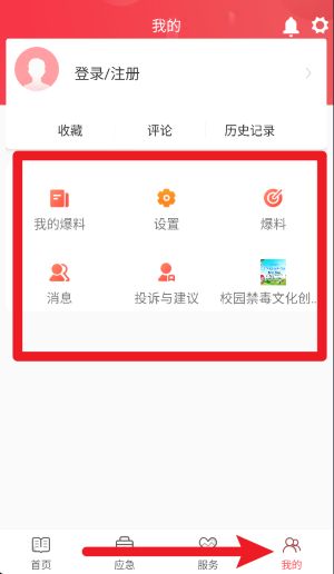 5、在我的页面中可查看收藏、评论和历史记录,还可进入设置、消息、爆料与投诉建议等个人相关操作入口。