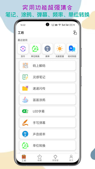 一个工坊是一款多功能工具箱应用,集合了超多实用小工具,设计轻巧,无需申请多余权限,各种工具打开即用,在日常记录、绘画创作等场景都能带来便捷体验,无需切换多个应用,明显提升操作效率,是生活中的好帮手。
