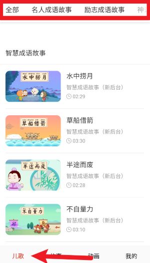 3、切换到底部故事栏目,可浏览各类儿童故事内容,支持按类型筛选智慧或励志故事。