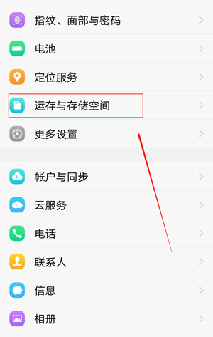 1、打开手机设置,下拉找到运存与存储空间,点击进入。