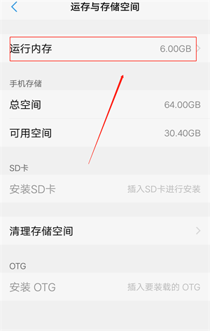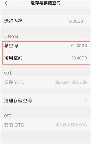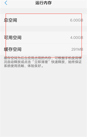 2、在运存与存储空间中,可查看手机内存总空间和可用空间(红框标注处)。