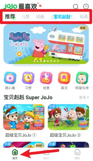 2、登录成功后进入首页,点击上方推荐、儿歌等标签,可快速浏览各类精选内容。