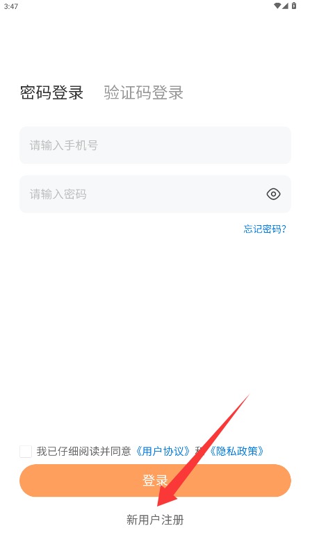 2、在登录界面找到底部的新用户注册入口,点击后跳转至账号注册创建页面。