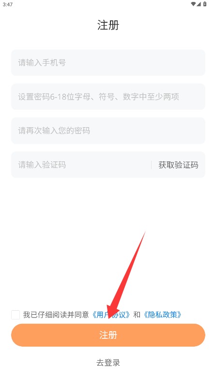3、按要求填写手机号码、设置密码并确认,输入短信验证码后勾选协议完成注册。
