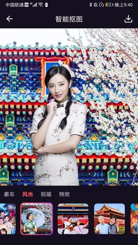 2、精细背景分类:抠图背景划分豪车、风光、祝福、特效等多个类别,查找使用更高效;