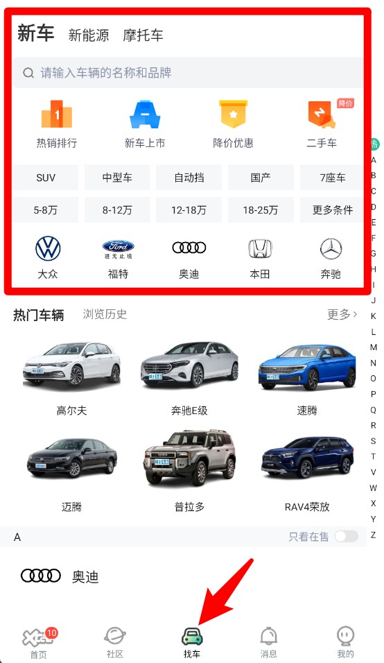 4、点击底部找车按钮可进入车辆选购页面,浏览新车、二手车信息并进行品牌筛选。