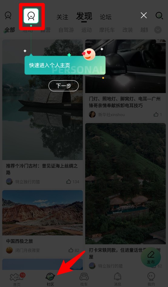 3、点击底部社区栏位可进入发现页,查看关注动态及进入个人主页发表互动内容。