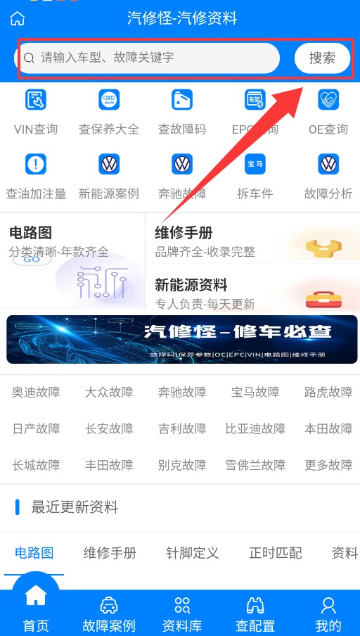 3、进入主界面点击顶部搜索框,输入关键词即可快速查询所需维修资料或服务网点。