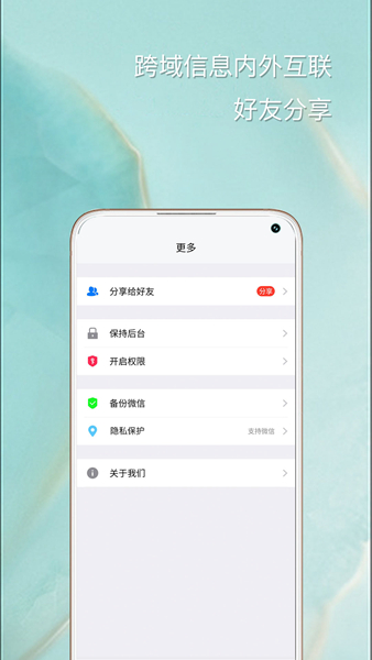 22项权限免费实现分身、朋友圈、小程序、相册等功能,启动手机内的正版微信多开分身,实现双开手机效果,不存在恶意下载等消耗流量行为。
