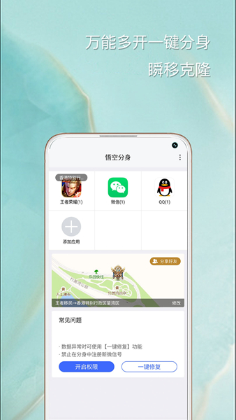 微信多开(悟空分身)在仅8MB的应用内存情况下,提供免费分身放桌面、多开分身消息通知、秘乐短视频、球球大作战穿越移民,专注应用分身满足白领、微商等人群多开需求。双开助手微信多开分身版——百万用户正在使用的免费版微信双开、微信多开、微信双开助手!