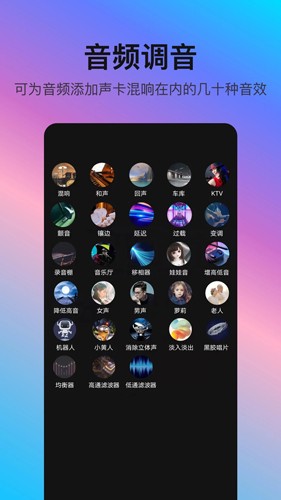 【音效添加】:为音频加音效,如和声,混响,高低音,黑胶唱片,音乐厅,录音棚,娃娃音,女变男声,男变女声等