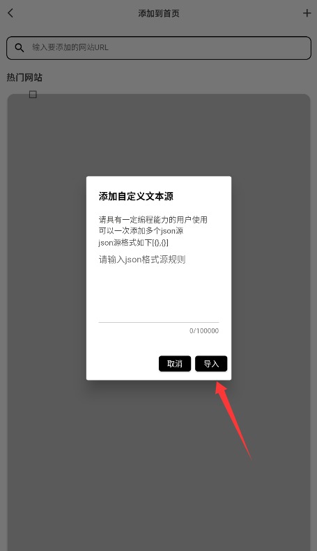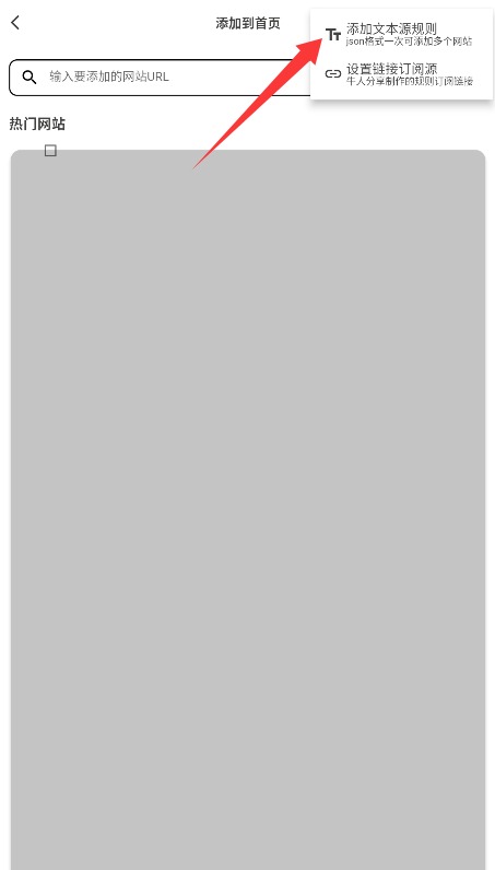 2、进入添加到首页功能后,点击右上角菜单按钮选择文本源规则导入方式。
