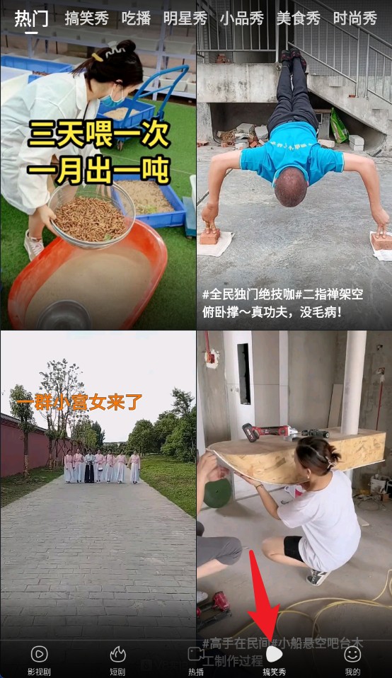 4.搞笑秀版块专注幽默短片,用户可上滑浏览,轻松解压娱乐氛围十足。