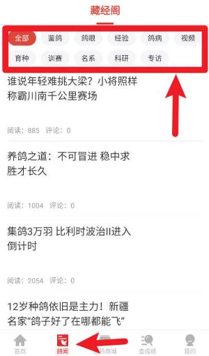 3、在鸽闻页面浏览资讯,根据分类标签阅读经验、训赛、科研等文章,获取专业知识快速提升实力。