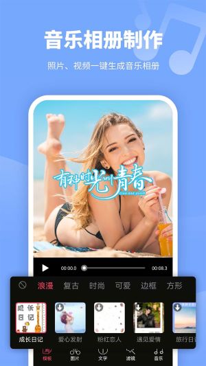 3、在音乐相册功能中上传素材,选择背景音乐和模板,点击生成即可输出成品。