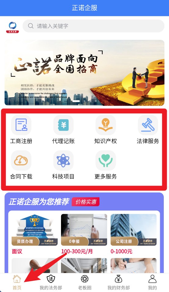 2、首页整合工商注册、代理记账、法律服务等热门企业服务入口,一键点击即刻办理。