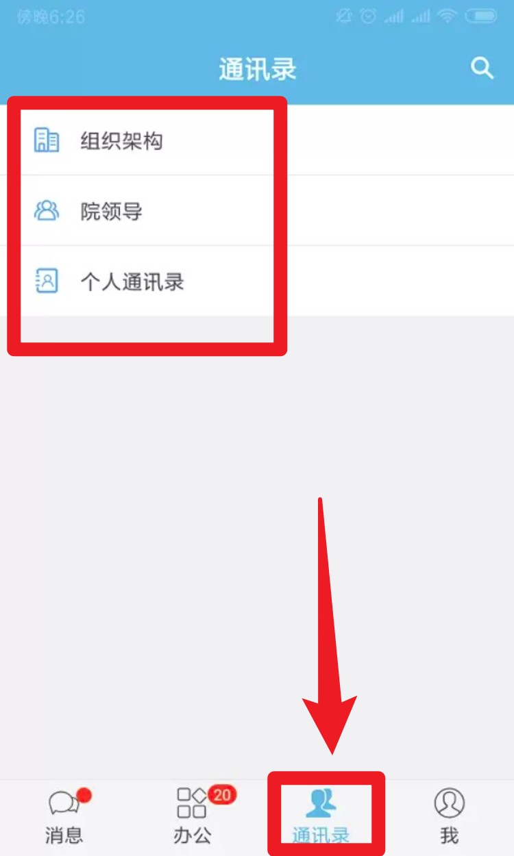 4. 需要联系同事时,可点底部通讯录,支持按组织架构查看或搜索个人资料。