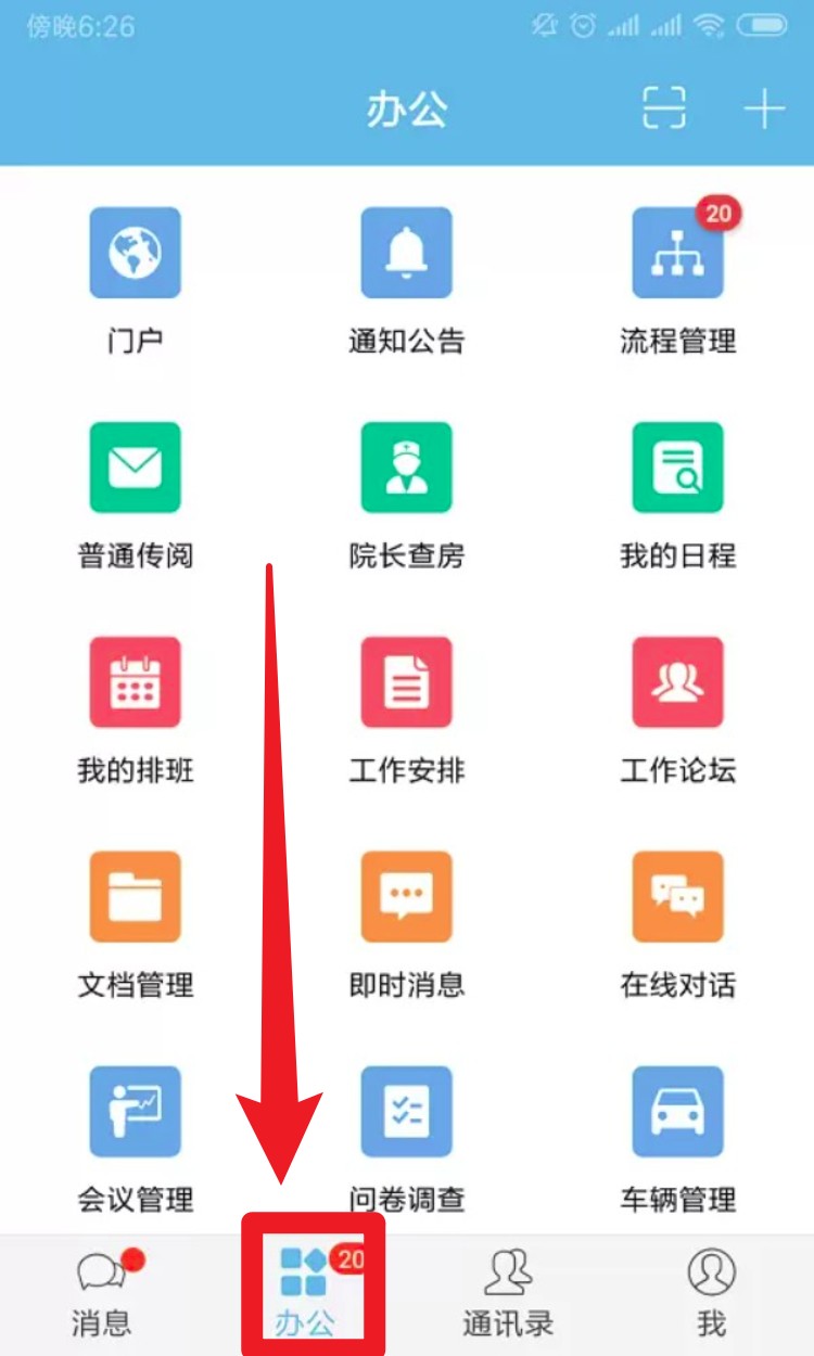 3. 登录成功后,点击底部办公图标,可进入审批流程、排班安排等模块。