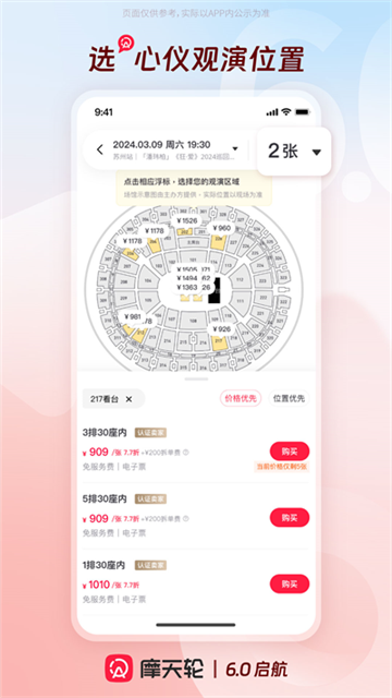 摩天轮票务平台整合了主办方、各级票务公司、以及个人的闲置票源,实现平台上90%的演出都有打折票,为消费者提供更为实惠的观演选择。
