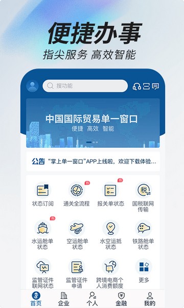 提供融资、出口信用保险相关业务状态查询和业务办理功能