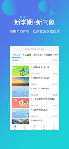 1.在线直播,随时针对学生开展直播,更有市级名师直播观摩,一键查看班级学生直播学习统计,对学生的管理贯穿课中和课后。