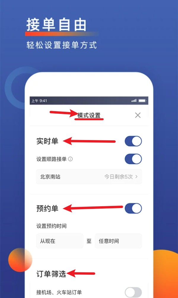 3. 进入模式设置可选择实时单或预约单,并启用订单筛选,提升接单效率。