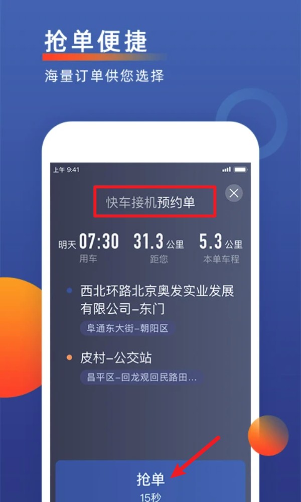 4. 收到系统派发的预约单时,可直接查看乘客信息与路线,确认后点击抢单。