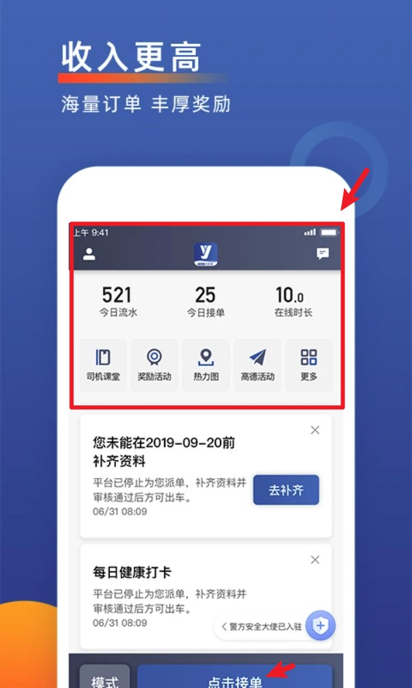 2. 登录后可在首页查看每日流水、接单数量及在线时长,点击点击接单开启接单模式。