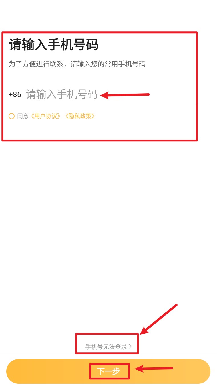 1. 打开App并输入常用手机号码,勾选协议后点击下一步完成登录或注册流程。