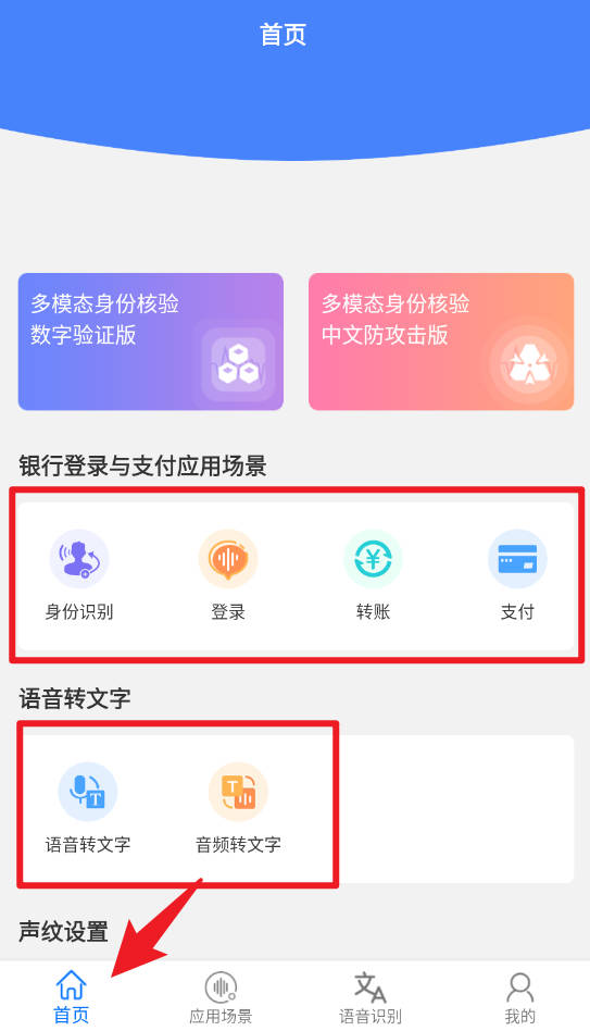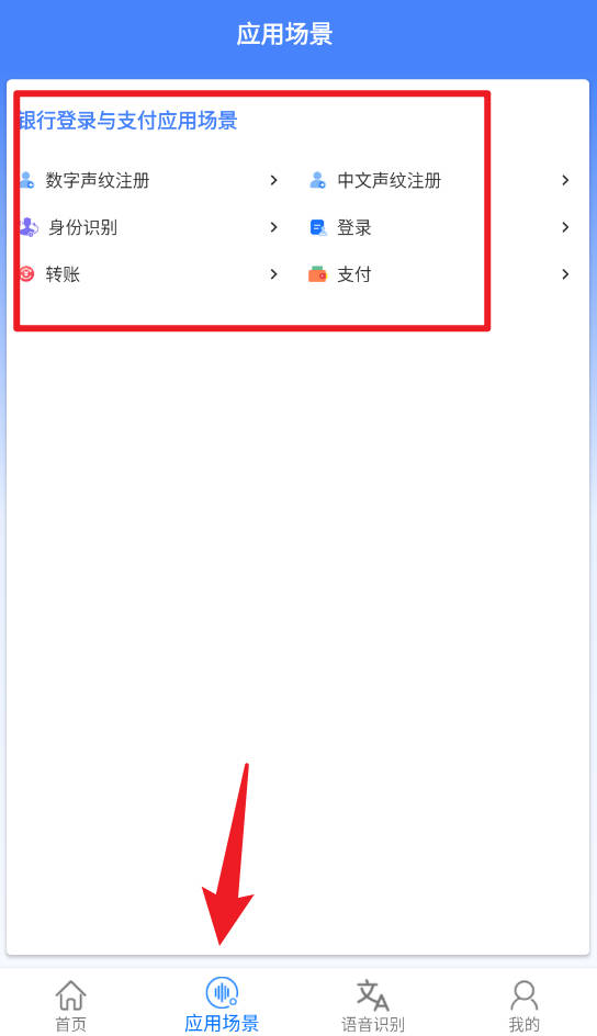 3、应用场景页面提供银行登录、身份识别、转账、支付等功能的详细入口,用户可以根据需求快速进行数字声纹或中文声纹注册及相关操作。