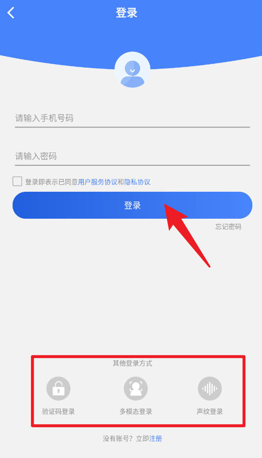 1、在登录页面中,用户可输入手机号与密码,勾选同意服务协议后点击登录按钮,或选择验证码登录、多模态登录及声纹登录等多种便捷方式。