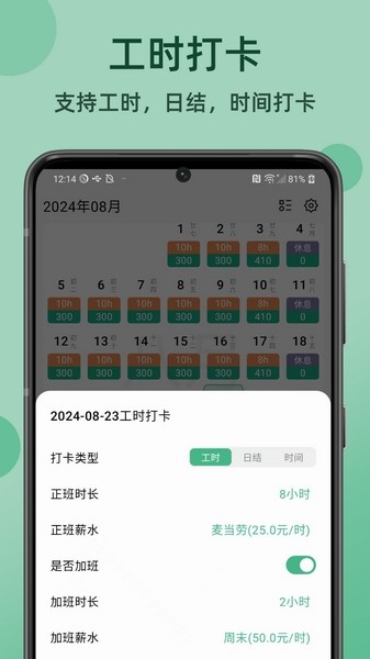3、薪水管理: 支持自定义每小时及加班工资的设置。
