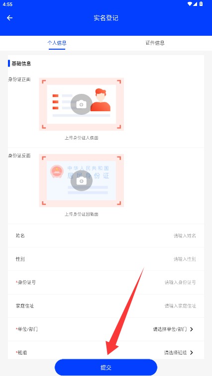 4、按要求上传身份证照片,填写详细个人信息和工作单位,确认无误后提交审核。